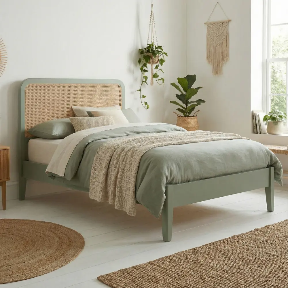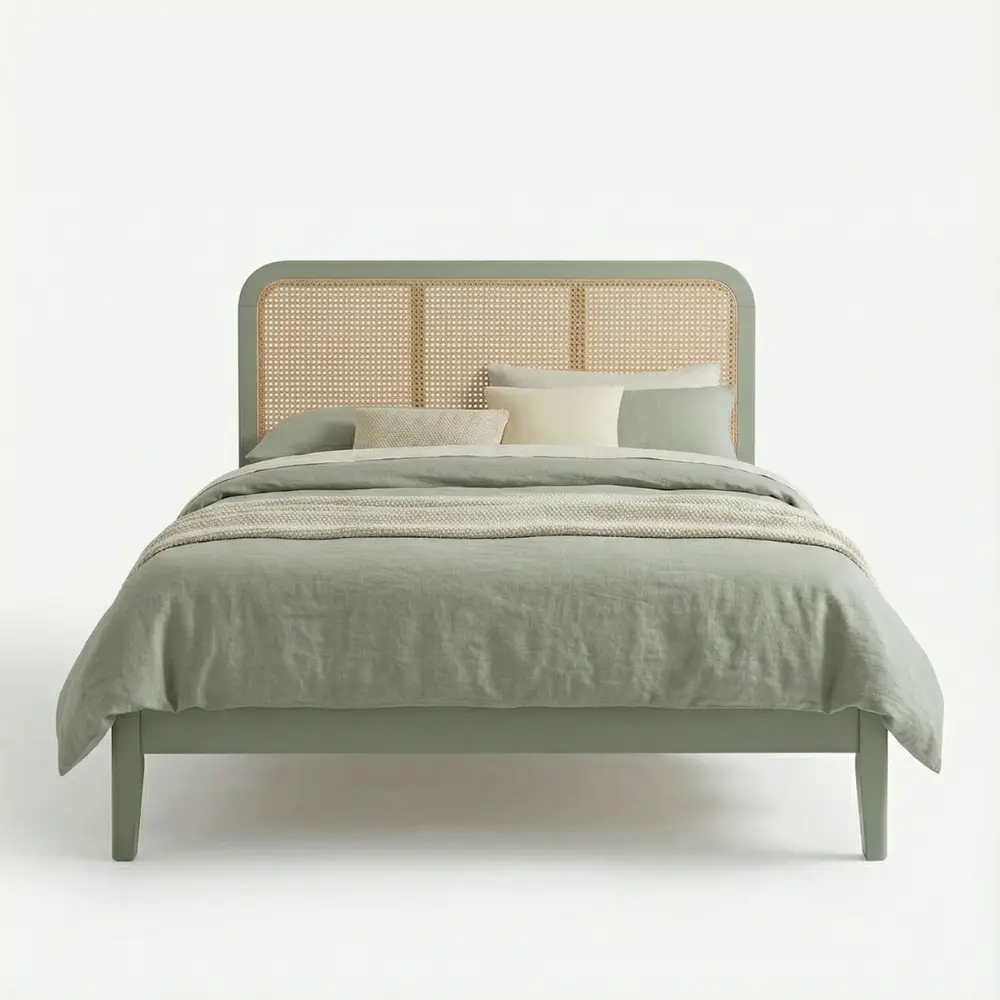 Ubah tampilan kamar tidur menjadi lebih segar dan menenangkan dengan Dipan Minimalis Japandi Rotan. Dibalut dengan warna Sage Green yang sedang tren, tempat tidur ini adalah solusi sempurna untuk Anda yang menginginkan desain interior