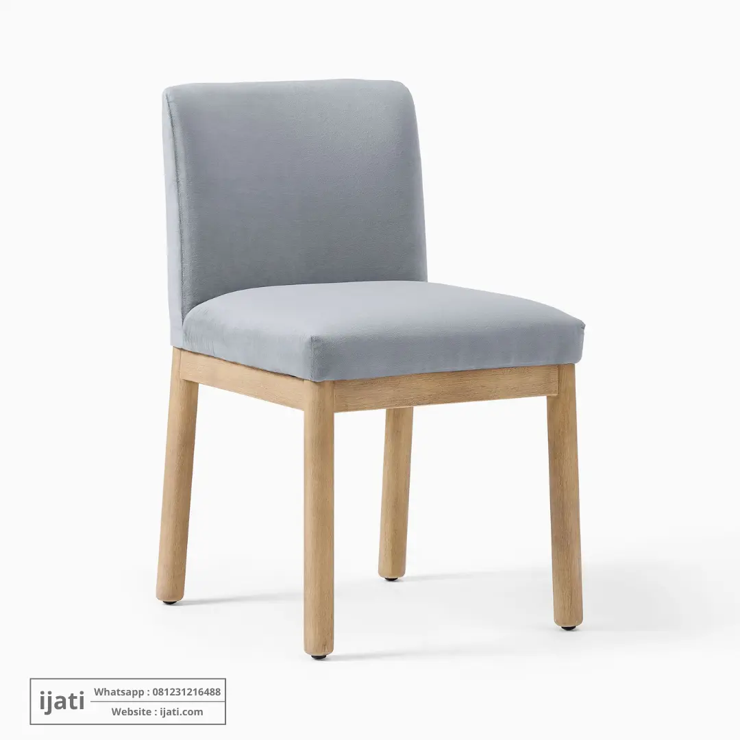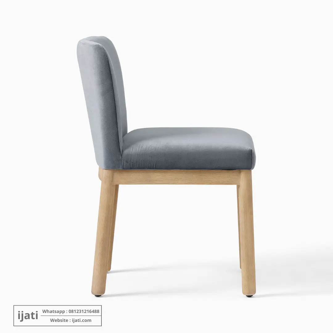 Kenyamanan adalah kunci dari desain ini. Seluruh bagian dudukan dan sandaran dilapisi secara penuh (full upholstery) dengan kain fabric premium yang terasa lembut di kulit namun tetap kuat untuk penggunaan sehari-hari. Warna abu-abu netral yang kami pilih tidak hanya menenangkan secara visual, tetapi juga sangat fleksibel untuk dipadukan dengan berbagai warna dan model meja makan. Di dalamnya, bantalan busa berkualitas tinggi memberikan topangan yang empuk dan suportif, memastikan Anda dan tamu Anda bisa duduk nyaman selama berjam-jam.