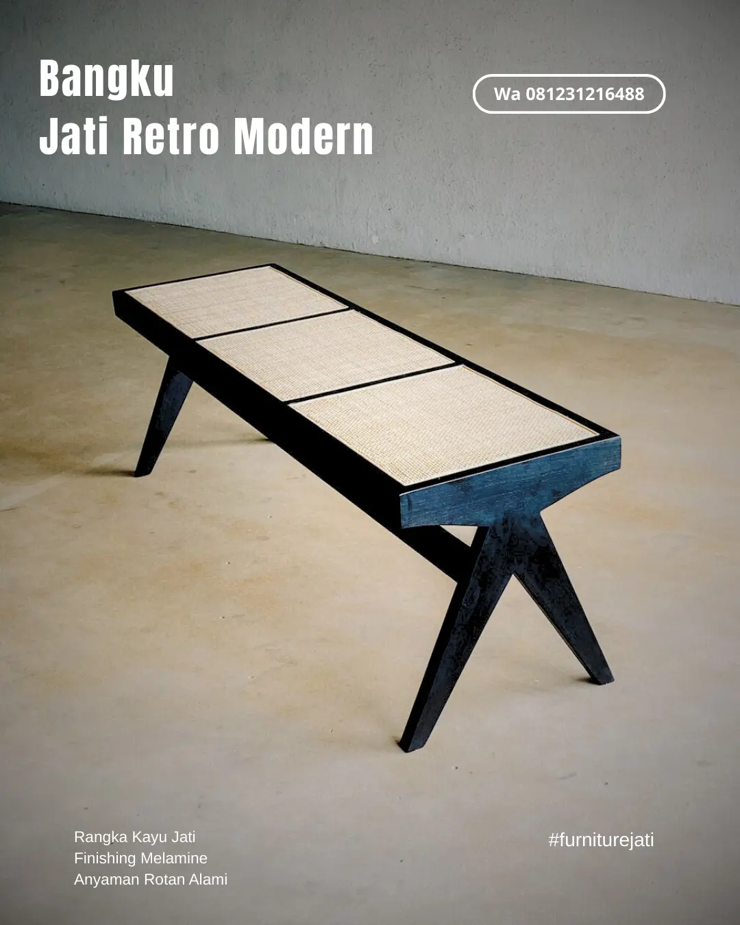 Bangku Kayu Jati Hitam Kombinasi Anyaman Rotan Alami – Eksklusivitas Retro Modern untuk Ruang Estetik