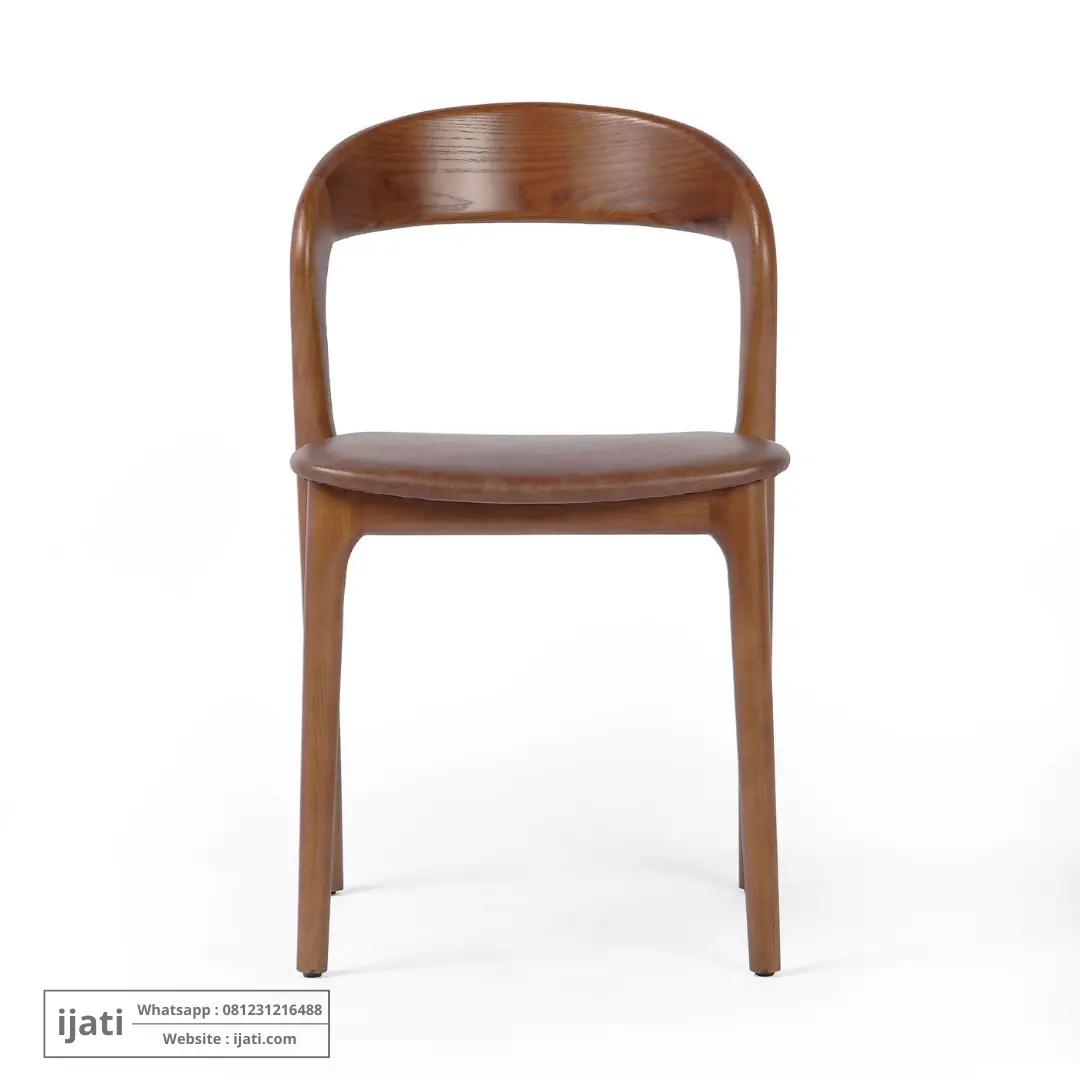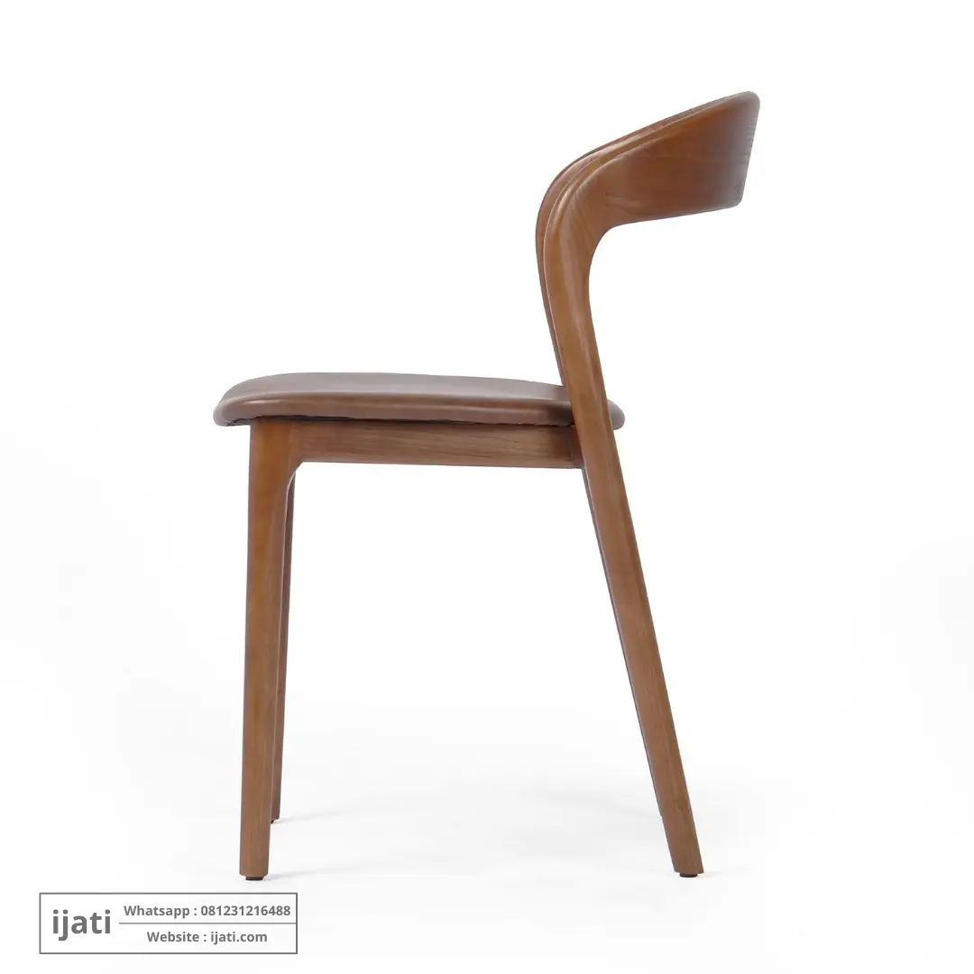 Keindahan bentuk ini didukung oleh kejujuran materialnya. Setiap kursi dibuat sepenuhnya dari 100% kayu solid (Kayu Jati Pilihan), menjamin durabilitas superior yang esensial untuk penggunaan di area komersial dengan frekuensi tinggi. Anda tidak perlu khawatir akan kekuatannya; ini adalah investasi jangka panjang yang akan bertahan dari masa ke masa. Kami melindunginya dengan lapisan finishing natural yang membiarkan keindahan serat kayu alami terpancar, artinya setiap kursi memiliki karakter uniknya sendiri.