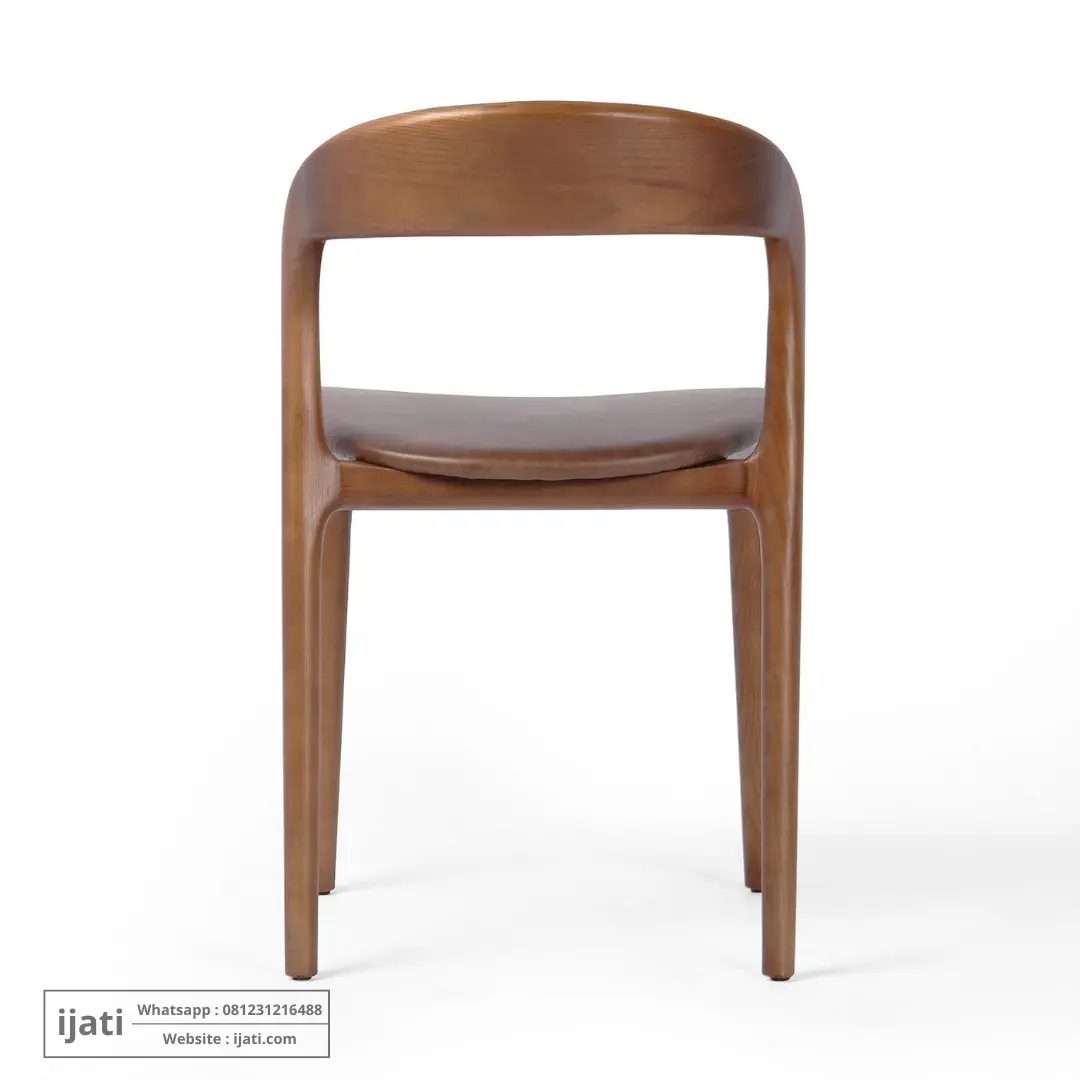 Daya tarik utama kursi ini terletak pada desainnya yang melengkung dan mengalir. Dibuat dengan teknik pengerjaan kayu tingkat tinggi, siluetnya yang organik seolah terbentuk dari satu garis kontinu, tanpa sudut yang kaku. Sandaran punggungnya yang melengkung tidak hanya menciptakan tampilan visual yang artistik, tetapi juga dirancang secara ergonomis untuk mendekap punggung dengan nyaman. Ini adalah detail desain yang mengundang tamu Anda untuk duduk lebih lama, bersantai, dan menikmati suasana yang Anda ciptakan.