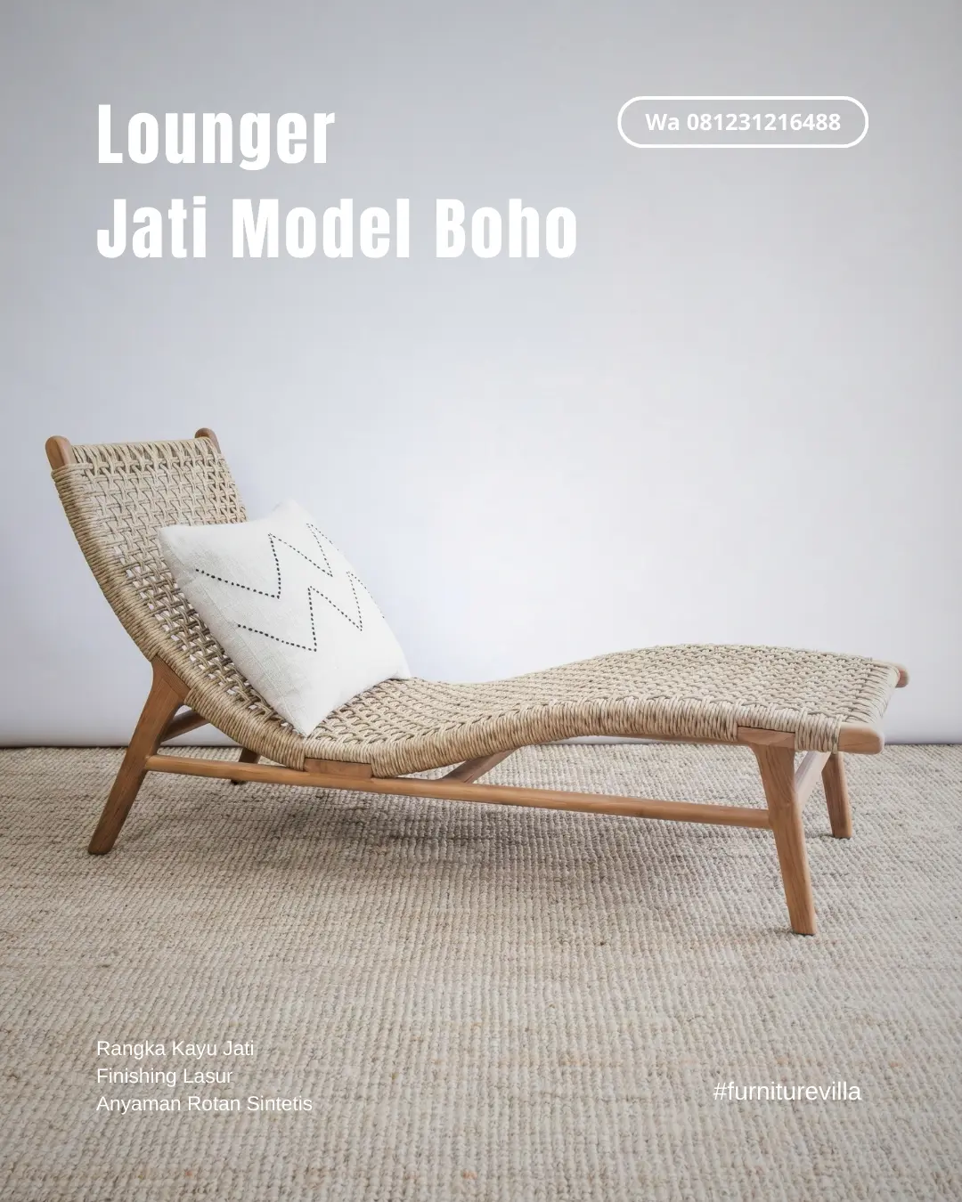 Ingin mengubah sudut teras atau area kolam renang menjadi zona relaksasi yang estetik? Sun Lounger Jati Minimalis kami adalah jawabannya. Mengusung konsep Bohemian-Chic yang hangat, kursi malas ini tidak hanya sekadar tempat duduk, tapi juga elemen dekorasi yang akan mempercantik hunian Anda.